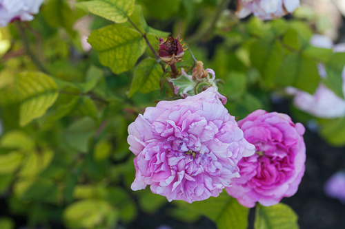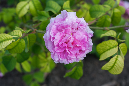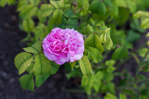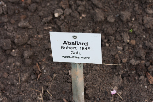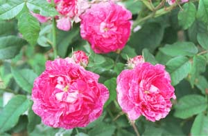 | Pysty, tummalehtinen pensas. Kukka kerrannainen, terälehdet neliöinä, rosetti, pieni keskisilmä. Karmiini, malvanväristä marmorointia. Voimakas tuoksu. | Roseraie de l'Haÿ |