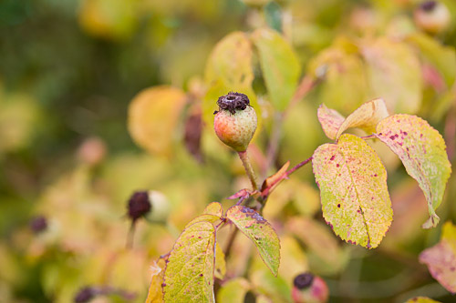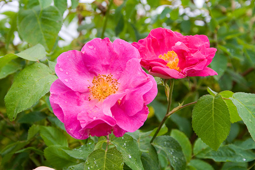 Kukka puolikerrannainen, n. 8 cm läpimitaltaan, viininpunainen, kullankeltaiset heteet, valkoinen keskiosa.