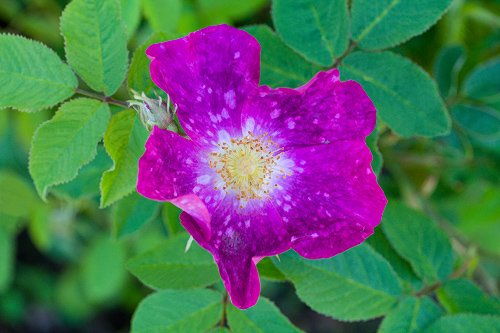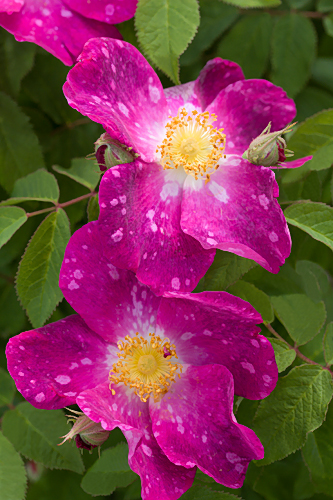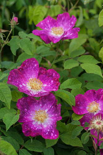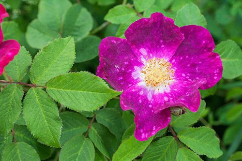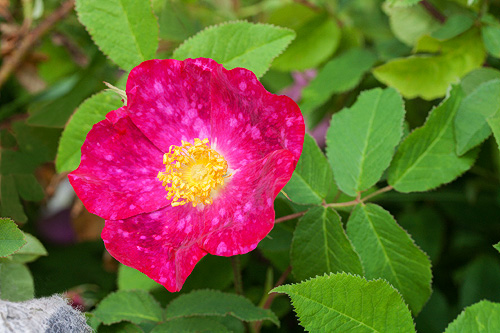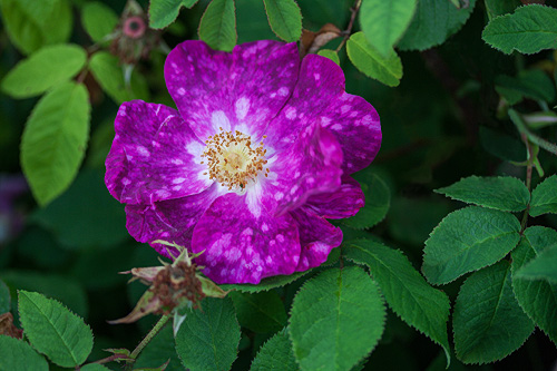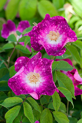 Pysty pensas on 1-1,3 m korkea. Juurivesoja muodostuu. Heinäkuussa avautuvat suuret yksinkertaiset kukat ovat aluksi kirsikanpunaiset, vaaleita läikkiä, valkoinen keskiosa. Värin muuttuessa violetinpunaiseksi vaaleanpunaiset läikät korostuvat, . Se on kauniin kärpässienimäinen. Kukinnan jälkeen pyöreät kiulukat ja punainen syysväri koristavat pensasta. |