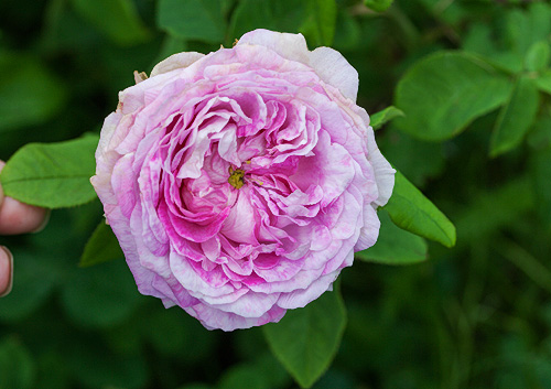 Kukka kerrottu, terälehdet neliömuodostelmissa, keskiosa roosa, reunat vaaleat, pieni vihertävänkeltainen silmä.