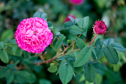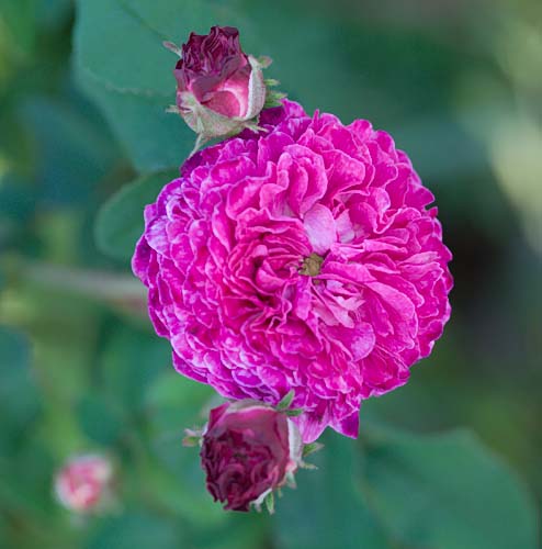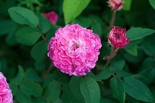 | F: Un petit rosier de 80 cm de haut, couvert de petites fleurs doubles, d'un rose carminé, un petit oeil au centre, parfumées. | |