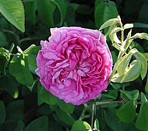 | Pysty, n. metrin korkuinen, lähes piikitön pensas. Punaiset nuput. Kukka iso (9 cm), kerrannainen, litteä, vaaleampi rosetti ja keskellä pieni silmä. Tumma rosa keskiosa, vaaleammat reunat, vaalenee. Melko vahva tuoksu. | |