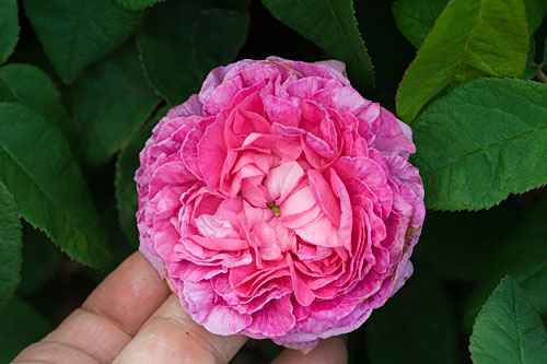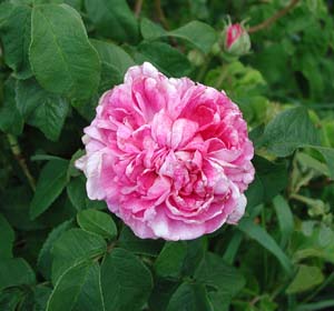 | D: Aufrechter, 100 cm hoher , robuster Busch. Fast stachellos. Rote Knospen. Die Blüten gross, 9 cm breit, gefüllt, flach, in unregelmässigen Vierteln. Die Blütenmitte dunkelrosa, der Rand heller. Stark duftend. | |