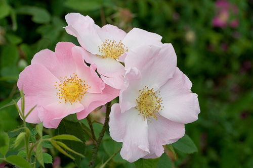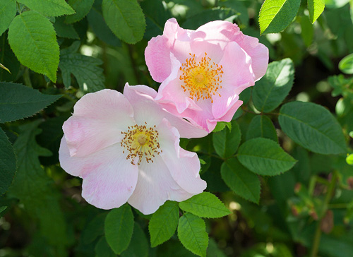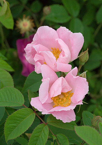 Kukka yksinkertainen, suuri, lohenpunainen, vaalea keskiosa, korostuneet kullankeltaiset heteet.