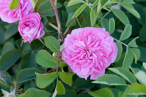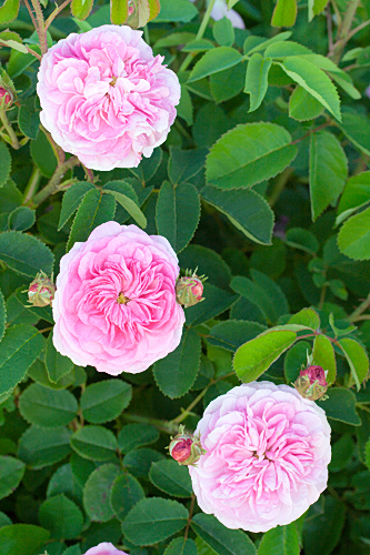 | ”Mooses” on pysty, 1-1,5 m korkea pensas, jossa on vahvat, piikikkäät oksat. Kukat ovat 2-3 kukinnoissa. Kukka on keskikokoinen, kerrottu, terälehdet neliöinä, rosetti pienen vihreän silmän ympärillä. Makea aniliini/roosa hiukan marmoroitu. Heikko tuoksu. |