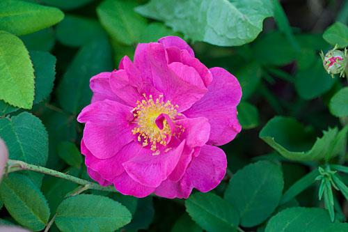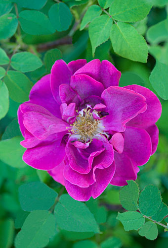 | Leveä pensas, 80 cm korkea. Kukka puolikerrannainen, n. 18 terälehteä, syvät lovet, keskellä pienmpiä terälehtiä. Erikoinen väri. Pohjavärinä voimakas aniliini, päällä sinertävää. Mieto tuoksu. Tummanpunaiset nuput. | |