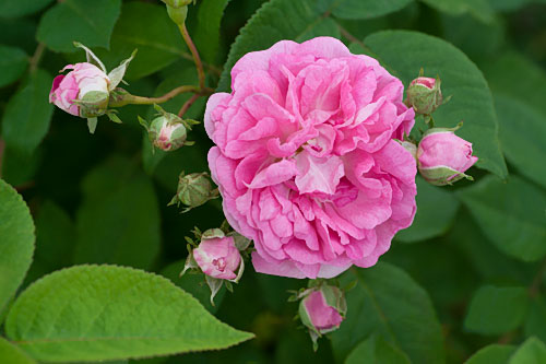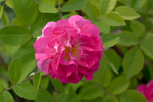 | Kukka 7 cm, kerrannainen, keskellä pieniä terälehtiä, aluksi kirsikanpunainen, myöhemmin violetinpunainen, reunat lilahtavat, keskellä vaaleaa, keltaiset heteet näkyvät, mieto tuoksu. Punaiset nuput. | |