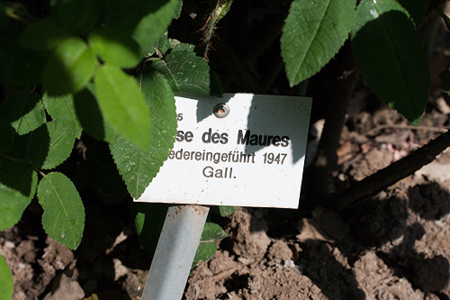 Sackville-West (1892-1962) löysi ruusun ostamastaan Sissinghurstin linnan villiintyneestä puutarhasta v. 1947. ”Maurien ruusu” –nimeä ei ole löydetty vanhemmista dokumenteista. |