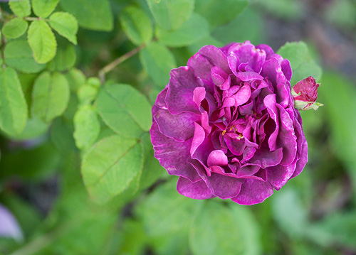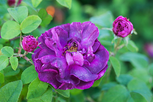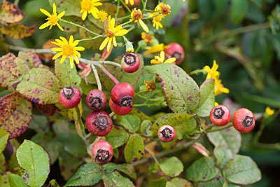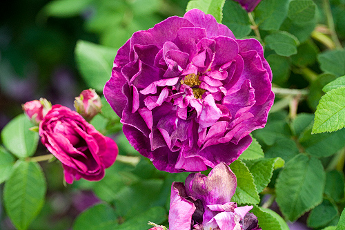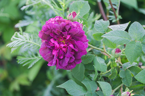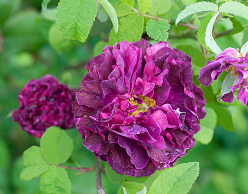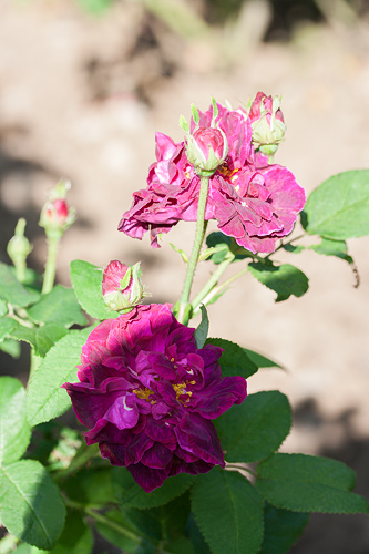 Kaunis ”Sissinghurstin linna” on kaarevaoksainen, metrin korkuinen pensas, mutta luumupuuta pitkin se on kiivennyt