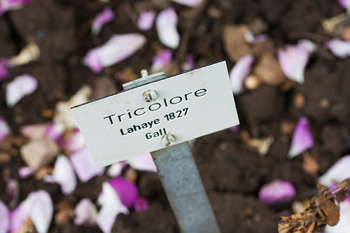 | Leveäkasvuinen ’Tricolore’ voi kasvaa 1-1,2 m korkuiseksi, runsaasti kukkivaksi pensaaksi. Keskikokoinen kukka on kerrottu, keskiosa karmiininpunainen, reunat sinertävät, usein valkoisia viiruja, terälehdet ylöspäin, myöhemmin ne kääntyvät yhä enemmän kohti keskiosaa, jolloin terälehtien aniliini ulkoreuna näkyy. Hiukan mielikuvitusta käyttäen voi syntyä vaikutelma trikolorista. Keskivahva tuoksu. |