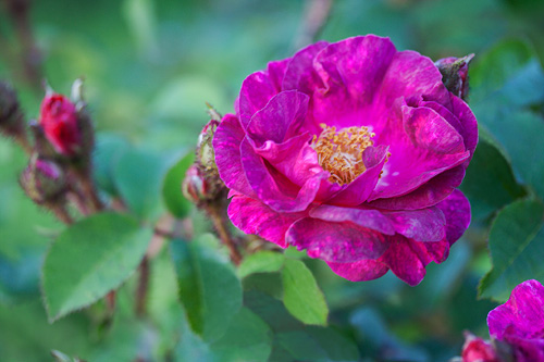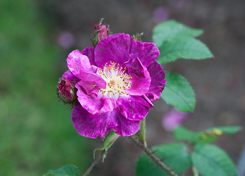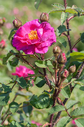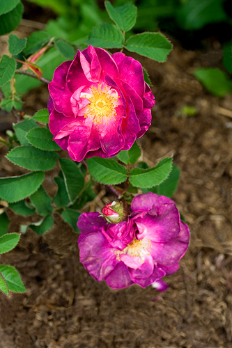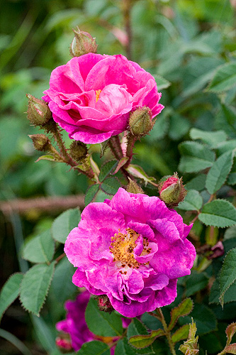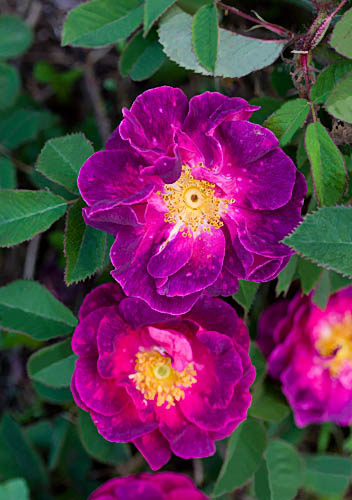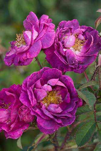 F: Les fleurs semi-doubles de 8 cm de diamètre forment des bouquets odorants rouge violet qui laissent voir des étamines d'or. |