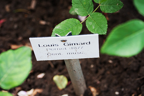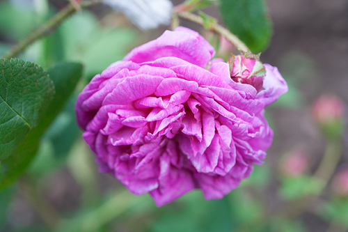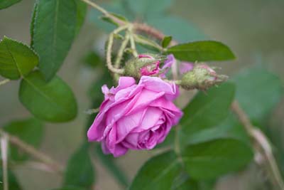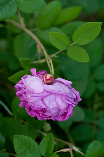 : Les boutons se couvrent de mousse sombre. Les fleurs doubles cramoisi clair.