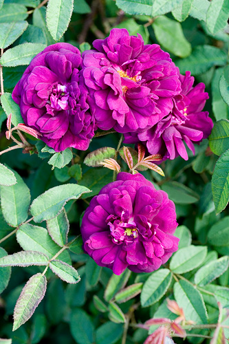 | F: Voici une merveilleuse rose ancienne. Ce rosier mousseux fleurit abondamment en juillet. Ses fleurs parfumées sont d'un pourpre profond, aux étamines dorées. Le rosier peut être utilisé en grimpant. | ![]() |