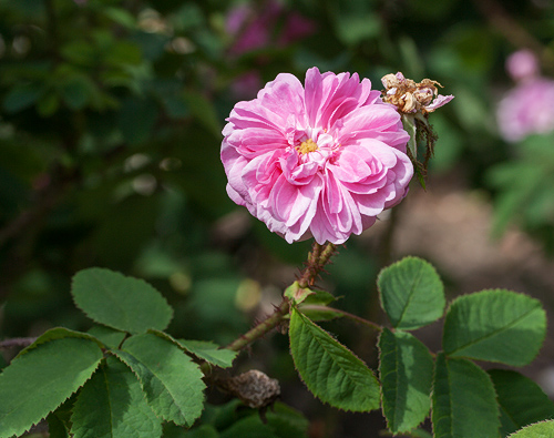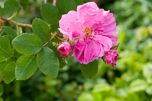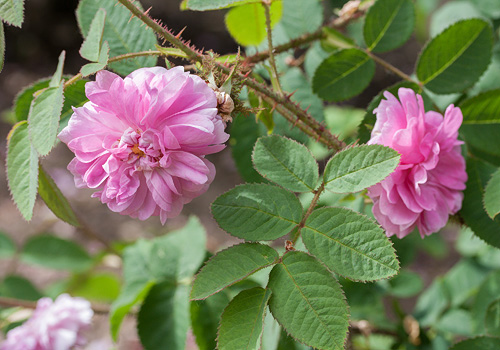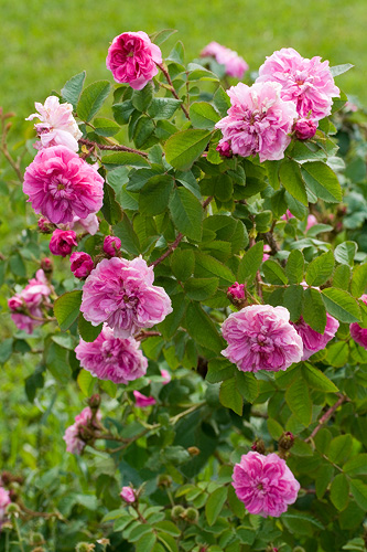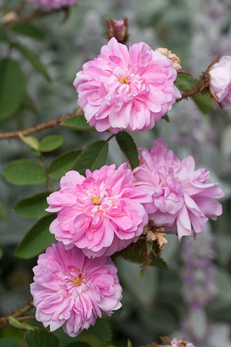 | Leveä pensas. 'Zoé' aloittaa runsaan kukintansa heinäkuun alussa. Kukka aniliini, reunat vaaleammat, hennon vaaleanpunaiset, keskellä rosetti ja vihertävän keltaiset matalat heteet. Hienostunut voimakas tuoksu. Runsaasti sammalta. | ![]() |