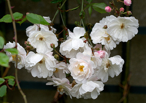 | Sempervirens-ryhmän köynnösruusu. 4-5 m korkea. Kukka pieni, puolikerrottu, riippuvissa tertuissa, aluksi kermanvalkoinen, sitten puhtaanvalkoinen, kirsikanpunaiset nuput. | |