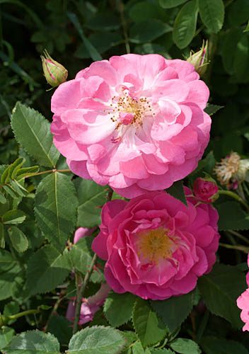 Macrantha-hybridi. Kukka suuri, 10 cm, lämpimän aniliininpunainen, haalistuu hiukan vanhetessaan. Punaiset nuput. Tummat leveät lehdet. Kolmiomaiset isot punaiset piikit.