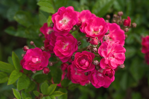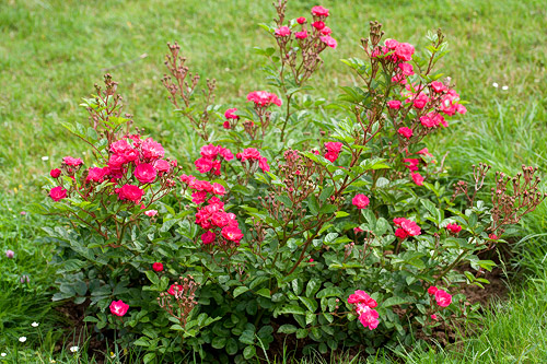 | F: C'est un petit polyantha de 50 à 60 cm, remontant. Les fleurs sont en bouquets de 30 à 40. La petite fleur est semi-double, rose rubis clair brillant (selon Levavasseur). | |