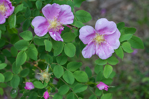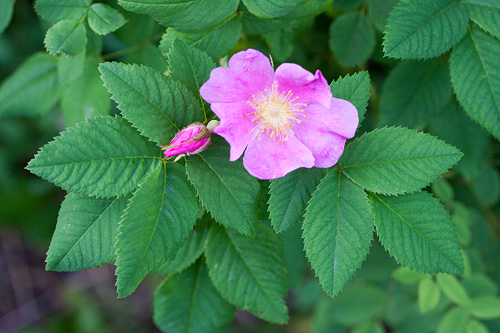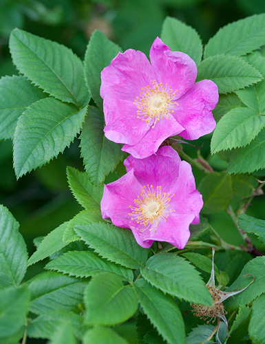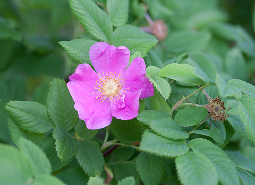 Isot vaaleat sahalaitaiset lehdet. Punaiset nuput. Pitkät verholehdet. Kukka yksinkertainen, 6 cm, rosa, keltaiset heteet, mausteinen tuoksu. "Tämän ruusun emopensas kasvoi Lahdessa Pikku-Vesijärven puistossa 1960-luvulla. Kukat ovat noin 7 cm leveät, lämpimänsävyisen vaaleanpunaiset. Kiulukat muistuttavat valamonruusun kiulukoita mutta kypsyvät aikaisemmin. Kasvurytmi on muutenkin koko ajan edellä valamonruusua. Syysväri on usein kauniin ruskeanpunainen. Ruusu on ollut täysin terve, härmää en ole huomannut koskaan." (Markku Kolhinen) |