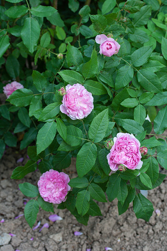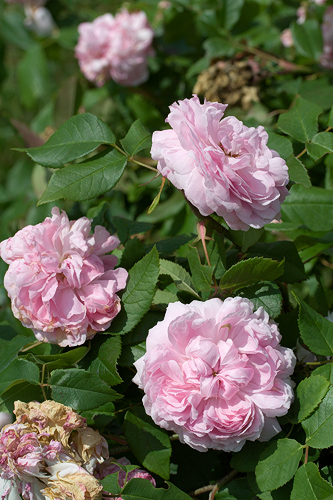 de 80 cm, fleurit en gros bouquets de fleurs très doubles,