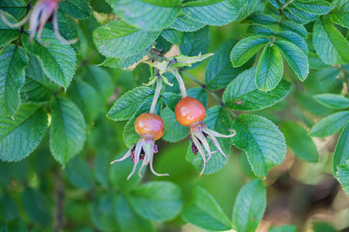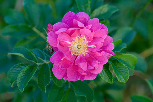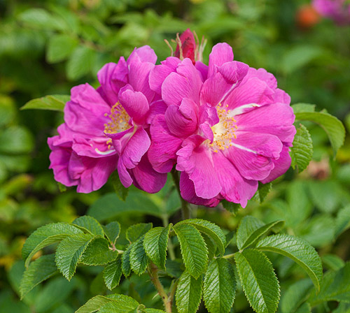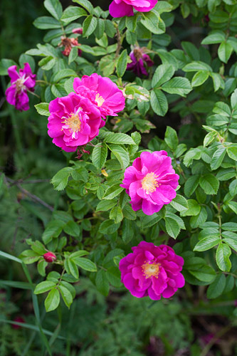 valkoisia raitoja. Voimakas tuoksu. Pienet rugosamaiset lehdet. D: Blüte: klein, 6 cm breit, halbgefüllt, anilinfarben, weisse Streifen, starker Duft. |