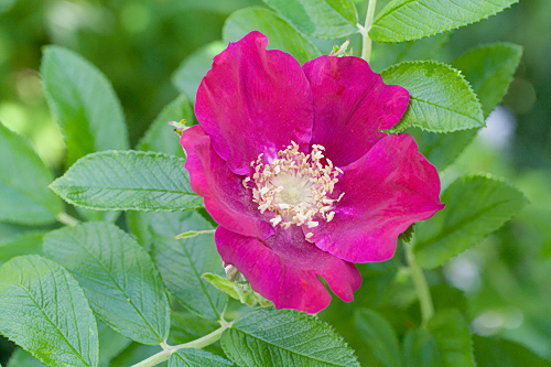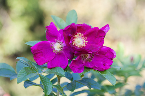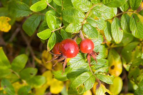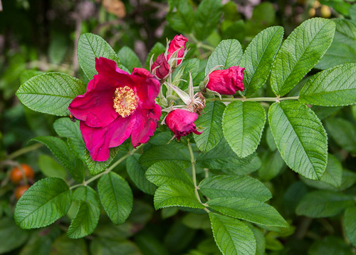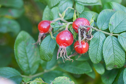 Duft. Laub: glänzend, schmal. Hagebutten. |