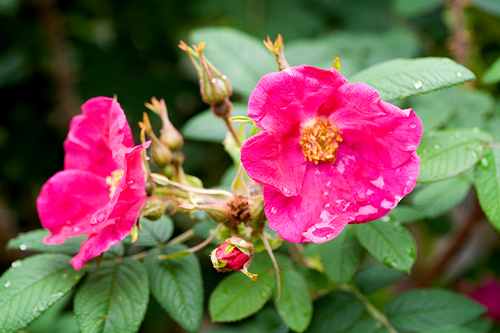 | Pystykasvuinen, 1,5 m korkea pensas. Jatkuva kukinta. Yksinkertaiset kukat karmiininpunaiset, keltaiset heteet. | |