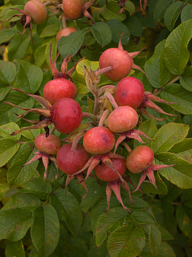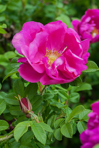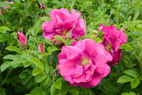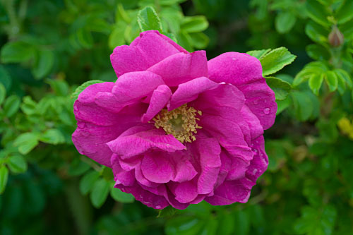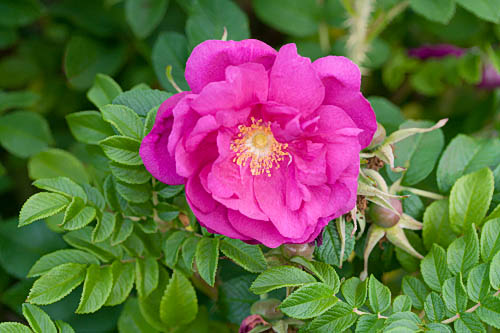 Kukka puolikerrannainen, violetinpunainen, keltaiset heteet, tuoksuva.