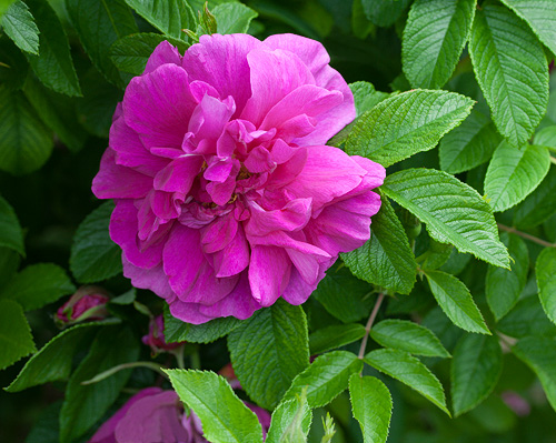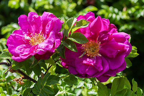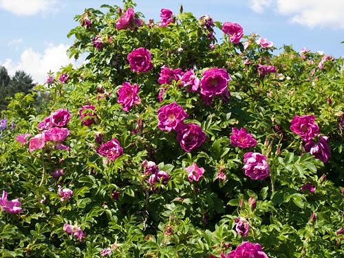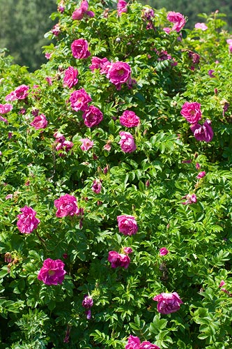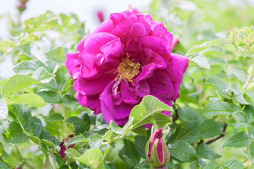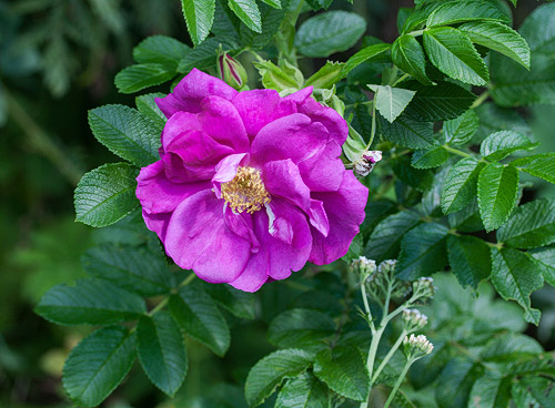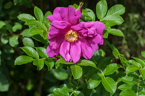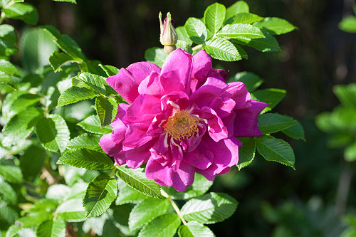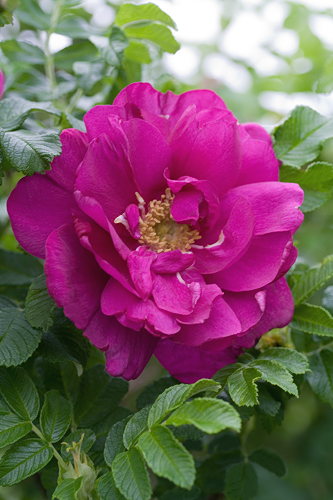 | Vaaleahkot paksut rugosanlehdet. Kukka isokokoinen, 10 cm, kerrannainen, n. 35 terälehteä, Tumman violetinpunainen, korostuneet loistavan keltaiset heteet, keskeltä lähtee joitakin valkoisia raitoja, voimakas makea tuoksu. Tummanpunaiset nuput. | D: Blüte: gross, 10 cm, gefüllt, ungefähr 35 Petalen, dunkelviolettrot, dicke goldgelbe Staubgefässe, einige weisse Streifen, duftet stark. |