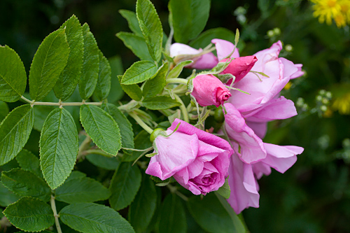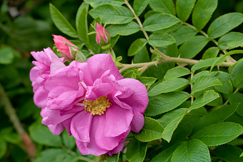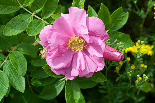 Kukka puolikerrannainen, 7-9 terälehteä, keskellä 4 pienempää. isohko, läpimitaltaan 8 cm, haalistunut aniliini, "vauvanvaaleanpunainen", paksut kullankeltaiset heteet. Kauniit punaiset nuput. Tuoksuu. Nahkamaiset lehdet D: Blüte: halbgefüllt, 7-9 Petalen, in der