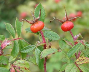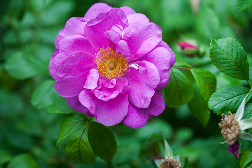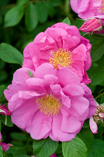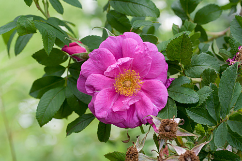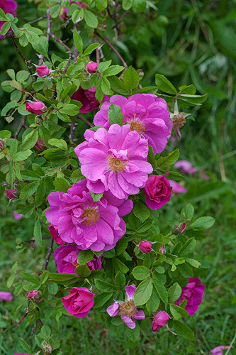 | Pysty pensas, joka sopii hyvin köynnösruusuksi, koska se tuettuna venyy ainakin 250 senttiä korkeaksi. Runsas kukinta heinäkuussa, myöhemmin vain joitakin kukkia. Kukka iso, 9 cm, puolikerrannainen, 3,5 kerrosta terälehtiä, voimakas aniliininpunainen, koristeelliset, keltaiset heteet. Voimakas tuoksu. Kiulukka litteänpyöreä, kirsikanpunainen, kukkavarsi karvainen. | |