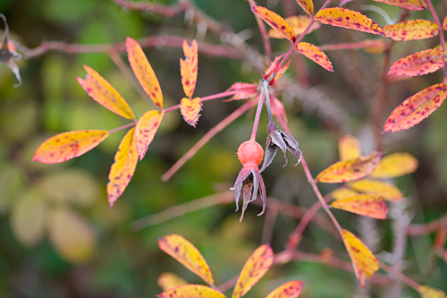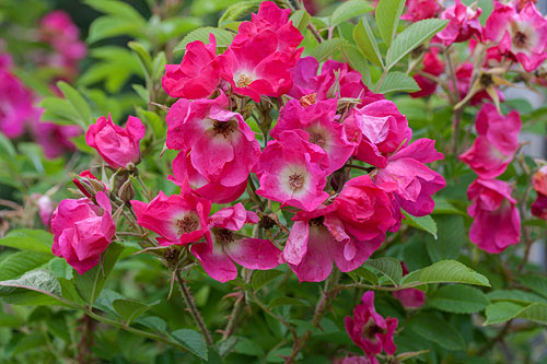 | Ruusun sanotaan kasvavan 2,5 m korkeaksi köynnösruusuksi. Meillä se on vielä 1,5 m korkea, runsaasti myöhään syksyyn asti kukkiva, ihastuttava pensas. Kukat ovat isoissa tertuissa. Yksittäinen kukka on pienehkö, karmiininpunainen, keskiosa valkoinen. Joitakin pienia kiulukoita muodostuu. | |