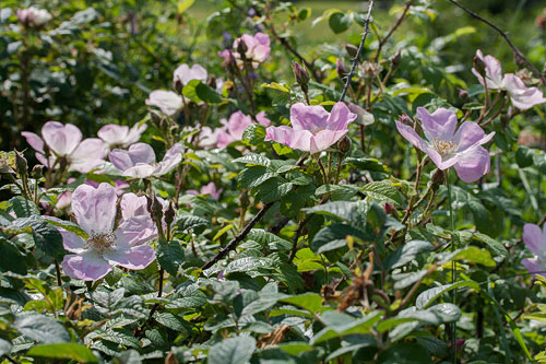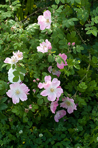| E: This tall arching bush with dark green leaves and thorny stems can reach 2,5 m. It can be grown as a climber. The flowers are large, single, pale pink, fading, with golden stamens. |