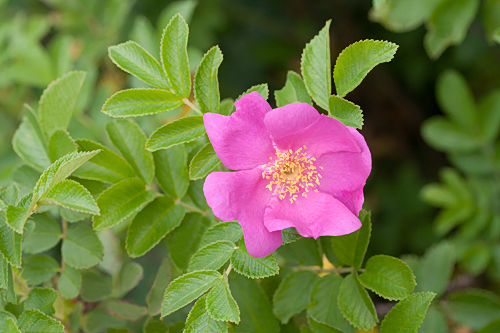 | Kukka yksinkertainen, pieni, 5 cm, violetinpunainen, vaalenee hiukan, korostuneet keltaiset heteet. Punaiset nuput. Vaaleat kapeat rugosanlehdet. Kaunis. | |
