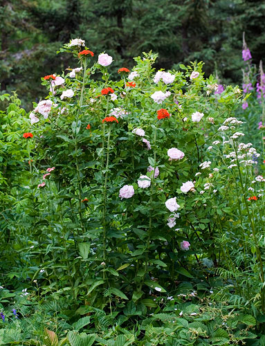 | E: 'Schneezwerg' seedling. The hardy bush grows to 1,50 m. Double blooms in soft pink with a strong flagrance on bright green foliage. | |