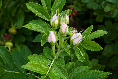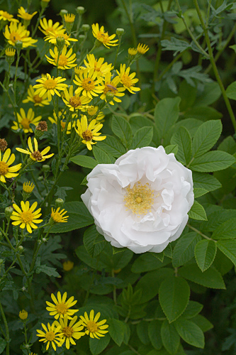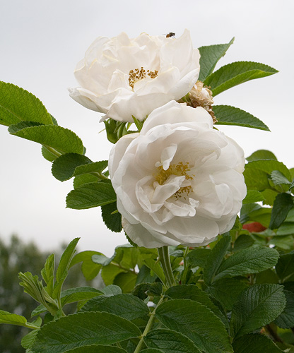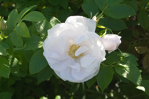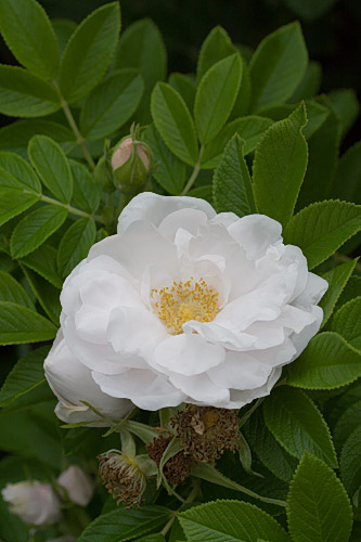 | 150 cm korkea pensas, joka kukkii myöhäiseen syksyyn asti. Kukka kerrannainen, kuppimainen, n. 30 terälehteä, puhtaanvalkoinen, kullankeltaiset heteet, tuoksuu. Vaaleanpunaiset nuput. Isoja kiulukoita muodostuu. | D: Blüte: gefüllt, ungefähr 30 Petalen, reinweiss, goldgelbe Staubgefässe, duftend. |