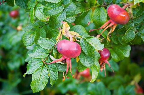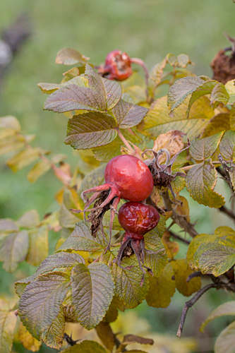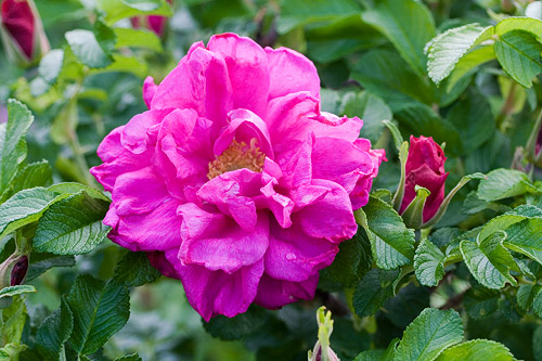 | E: This rose will grow up to 130cm, it is very thorny. The recurrent flowers are large, loosely double, crimson-purpre, yellow stamens. The fragrance is strong. Large scarlet hips. Very hardy. | |