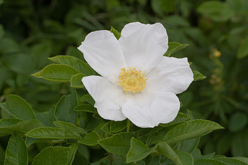 | Pensas parin metrin korkuinen, terve. Harmahtavan vihreine lehtineen se tuo mieleen 'White Hedgen'. Kukka yksinkertainen, 5-6 terälehteä, suuri, läpimitta 9-11 cm, puhtaan valkoinen, keltaiset heteet, mausteiselta tuoksuva. Vaaleanpunaiset nuput. Kiulukoita muodostuu runsaasti. | ![]() |