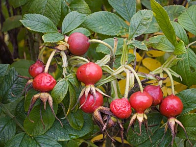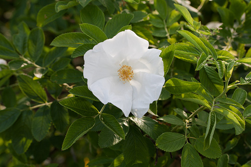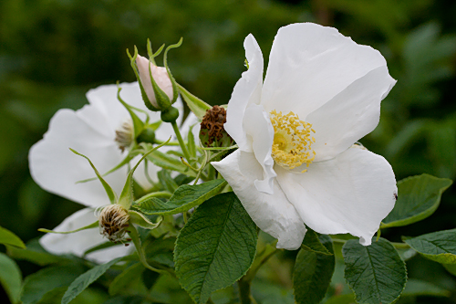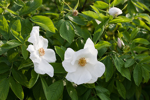 | E: This large, dense and thorny shrub can reach 2,5 m. The single, pure white, recurrent flowers are large and sweetly scented. Yellow autumn foliage and a lot of red hips. Suitable for hedging. |
