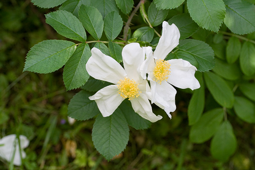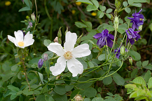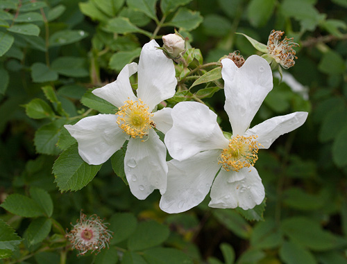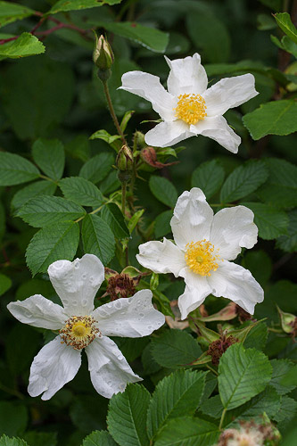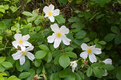 | D: Eine niedrige Bodendeckerrose mit über 3 m langen, stacheligen und borstigen, bogenförmigen Trieben. Einmalblühend. Besonders schöne einfache, reinweisse Blüten mit goldgelben Staubgefässen. Keine Hagebutten. Ziemlich winterhart. | |