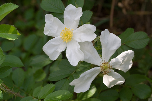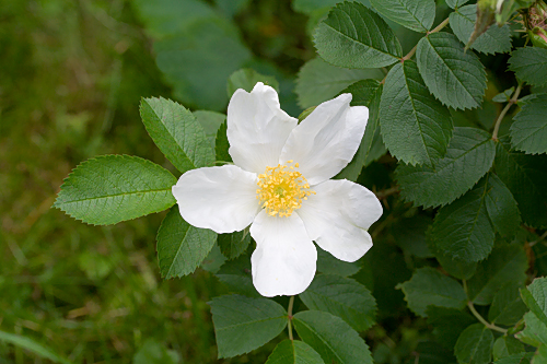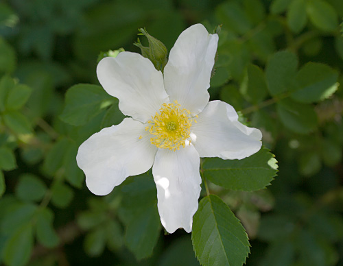 | Ruusu kasvaa maanmyötäisesti, oksat jopa 3 m pitkiä ja erittäin piikkisiä. Kukka keskikokoinen, yksinkertainen, terälehdet erillään. | |