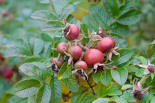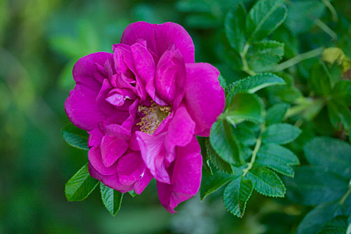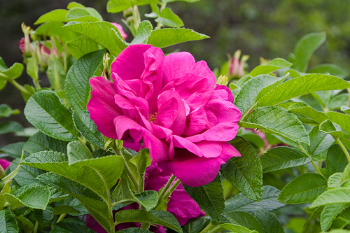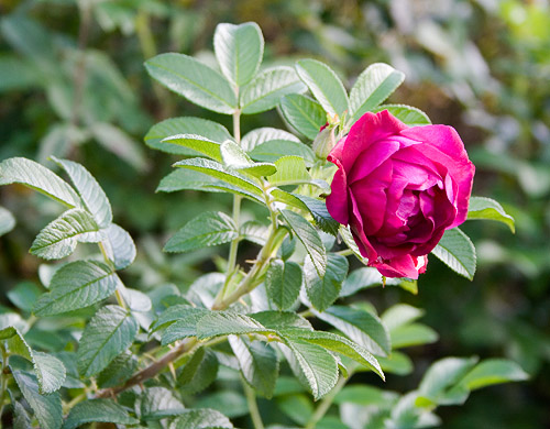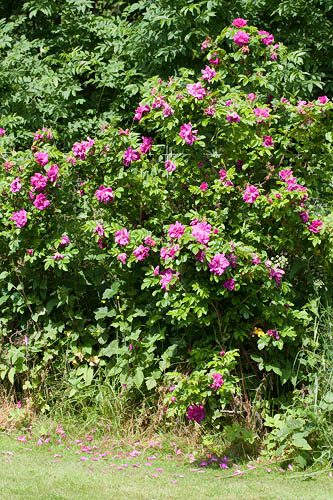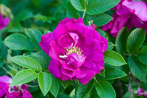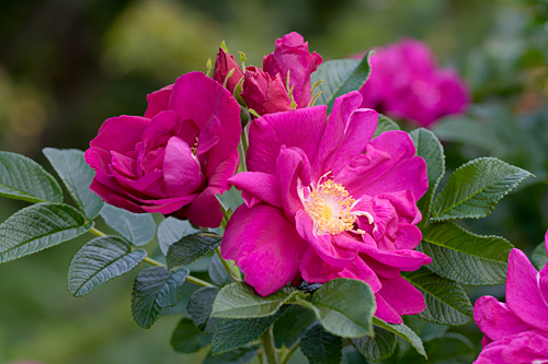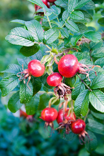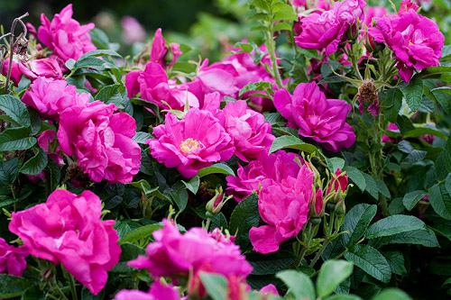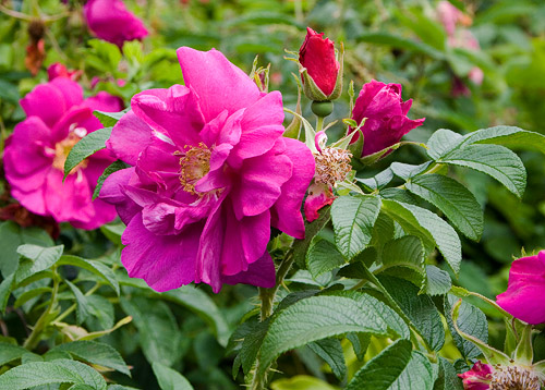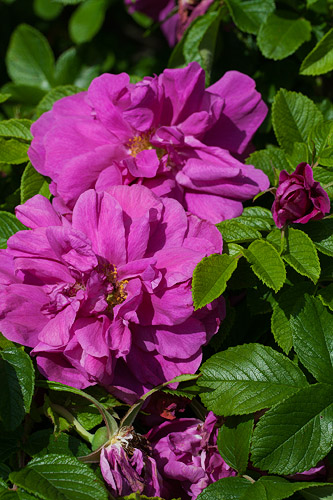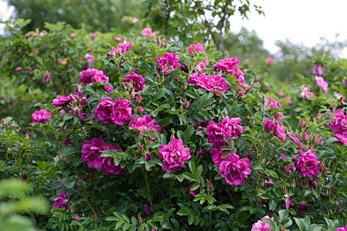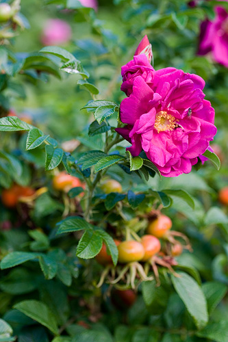 | F: Remontant. Les fleurs semi-doubles, odorantes, pourpre violet. Après la floraison le rosier s'orne de fruits rouge tomate décoratifs. | |