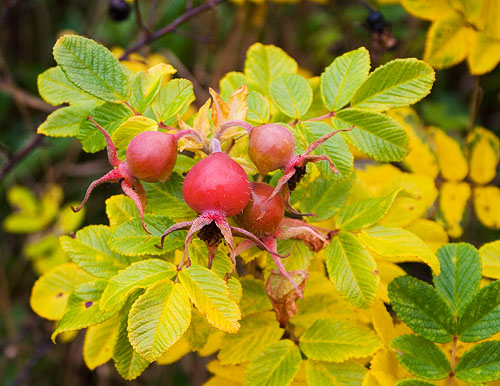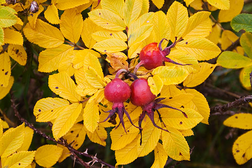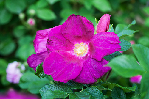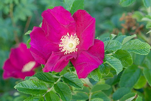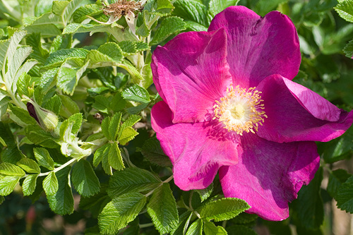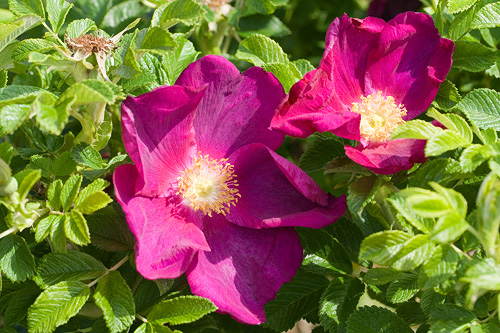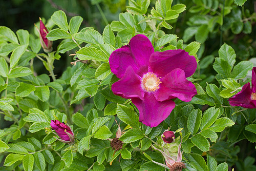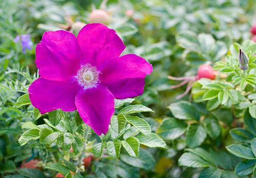 | E: The beautiful flowers are large, single, deep wine-crimson and fragrant. 'Rugspin' bears large orange-red hips. |