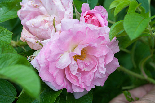 | D: "'Sachalin', eingefürt durch Rolf Sievers/Ingwer J. Jensen 1988. Blütenfarbe rosa mit weisslichen Reflexen. Blüte gut gefüllt, zu mehreren pro Stiel. Pflanze starktriebig, sehr stachelig, frosthart. Laub sehr gesund. Keine Hagebutten. Öfterblühend. Höhe um 130-150 cm." |