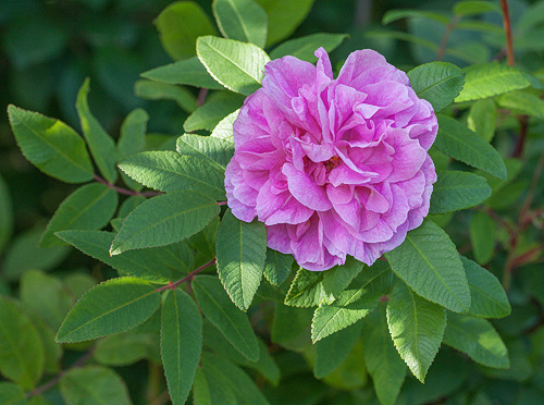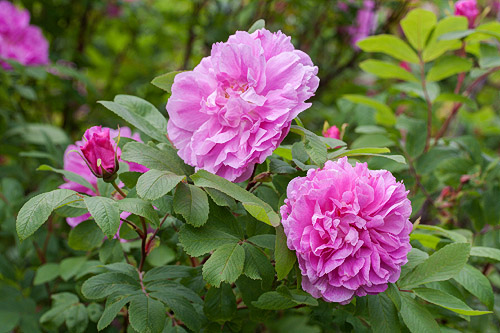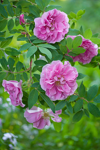 | Kestävä pensas on yli 3 metriä korkea ja leveä. Kukka keskikokoinen tai suuri (jopa 9 cm), kerrannainen, vaaleanpunainen. Mieto tuoksu. Kiulukoita ei yleensä muodostu. | |
