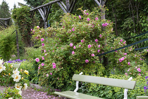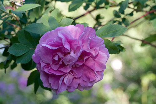 | F: C'est un buisson rustique de 2-3 m de hauteur qui fleurit sans cesse jusqu'aux gelées. Il se plaît aussi à mi-ombre. Les fleurs sont grandes, de 8-9 cm de diamètre, doubles, d'un joli rose tendre, parfumées. Pas beaucoup de fruits. | |