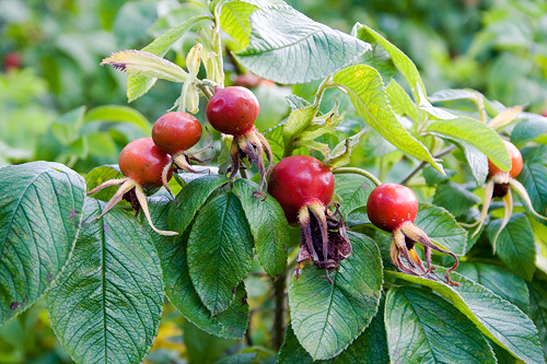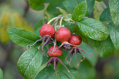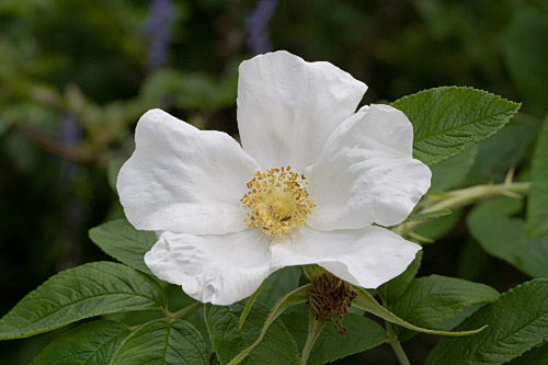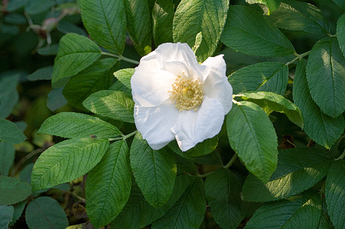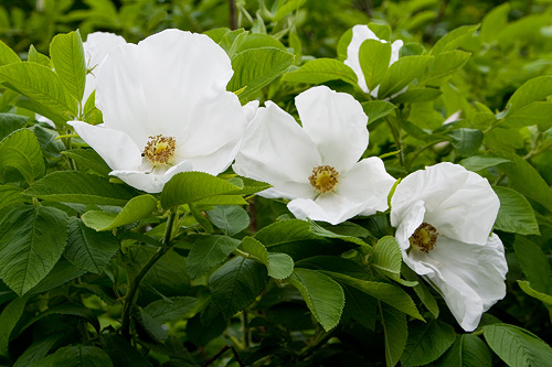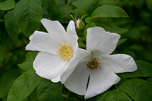 | D: 1,50 m hoher Strauch, der reich und lange blüht. Reinweisse, grosse, sogar 11 cm breite, duftende Blüten einzeln oder in kleinen Büscheln. Remontiert. Zahlreiche zierende Hagebutten. | |