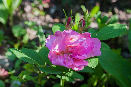 | 'Zaiga' on 100-120 cm korkea, kaarevaoksainen, lähes piikitön pensas. Se kukkii keskikesästä syksyyn asti. Kukka on suuri, puolikerrottu, vaaleanpunainen, miedosti tuoksuva. | |