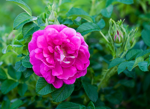 | ’ERKKI RAUTIO’ 180 cm korkea, pysty pensas. Pienehköt rugosan lehdykät. Voimakkaasti tuoksuva kukka on suuri, kerrannainen, violetinpunainen. Paljon isoja punaisia kiulukoita. I-V |