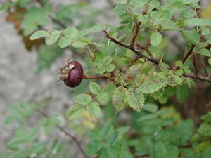 vajaa 20 ja ne taipuvat usein alaspäin. Kukkaperä ja kukkapohja piikkiset, verholehdet karvaiset ja haaraiset. Kiulukka musta, litteänpyöreä, tummanpunaisia piikkejä. Verholehdet aivan pienet, kolmiomaiset. Pysty pensas, n. 140 cm korkea, piikkinen pensas, alaosa jää paljaaksi. Versoissa on isoja piikkejä, kolmiomaisia ja alempana harjasmaisia. Muistuttaa 'Auroraa'. |