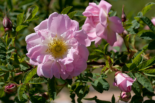 ’Ruskela’ Tämä kaunis pimpinellaruusu on löydetty 1990-luvun alussa Ruskelasta, Vihdistä, Helsingin läheltä. Myöhemmin sitä on löytynyt myös Vaalimaalta Kaakkois-Suomesta ja Viipurin läheltä Karjalasta. ’Ruskela’ voisi siis olla peräisin Pietarista. Ruusun on myös arveltu olevan ’Lady Hamilton’, mutta asiaa ei ole pystytty varmistamaan. ’Ruskela’ kasvaa 1,5 m korkeaksi pensaaksi. Lehdet ovat suuremmat kuin juhannusruusulla ja se kukkii hiukan juhannusruusua myöhemmin. Ihastuttava kerrannainen kukka on kuppimainen, myöhemmin litteä, 7 cm leveä, vaaleanpunainen, tuoksuva. Tummanpunaisia, hieman pitkulaisia kiulukoita muodostuu melko paljon. |